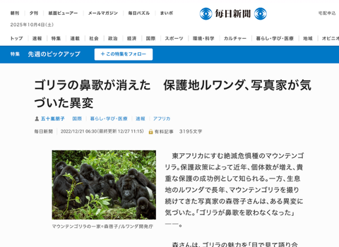 いま、マウンテンゴリラのいる火山国立公園に名前が付いて人に慣れたゴリラは300頭います。