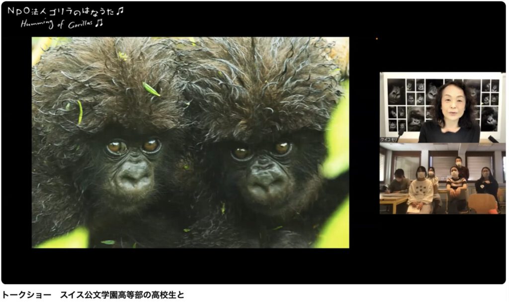 「なぜゴリラを絶やしてはならないのか」をテーマに、スイス公文学園高等部の高校生たちにお話ししました。