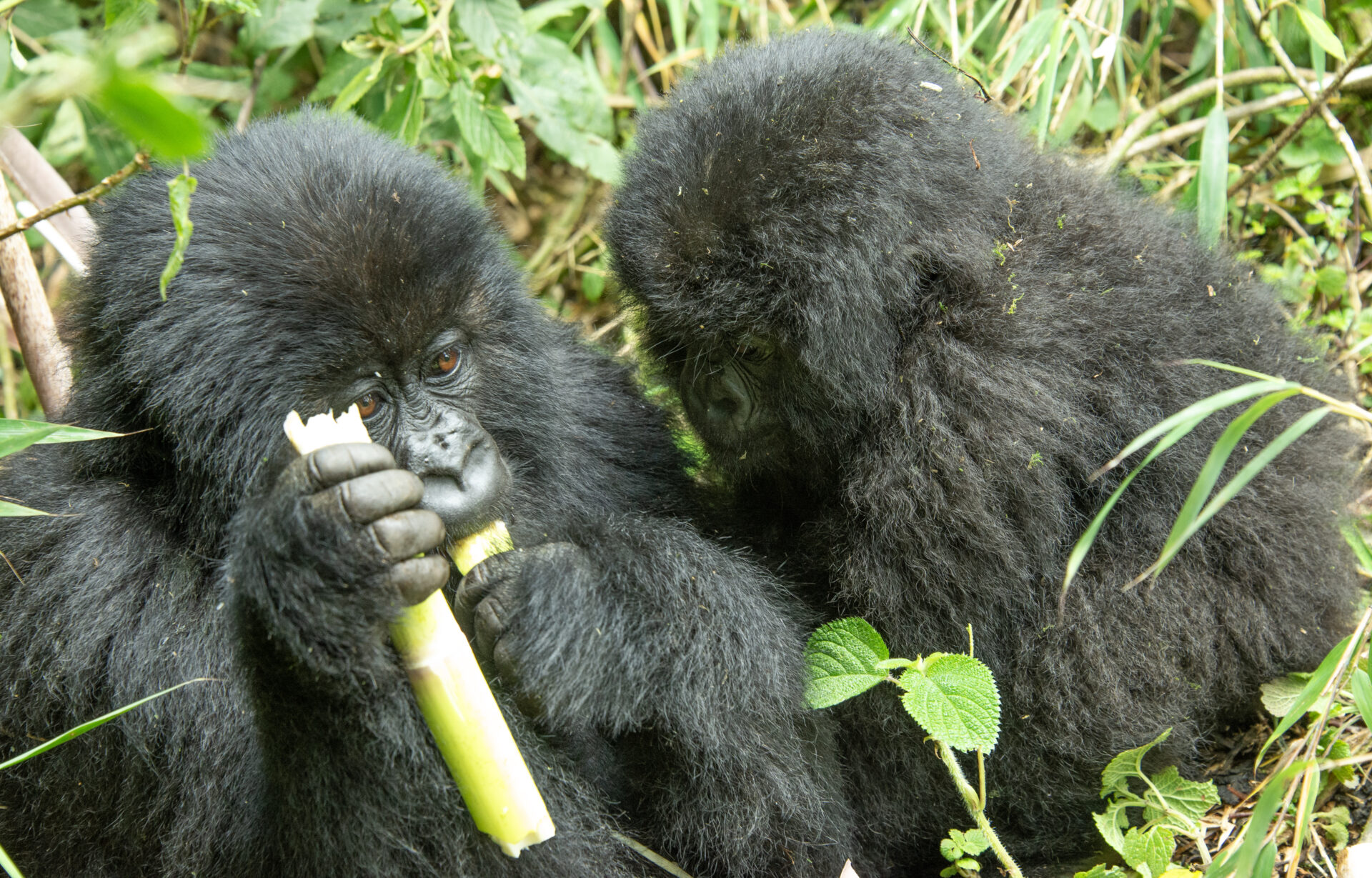 たけのこを食べるゴリラを見つめるゴリラ』