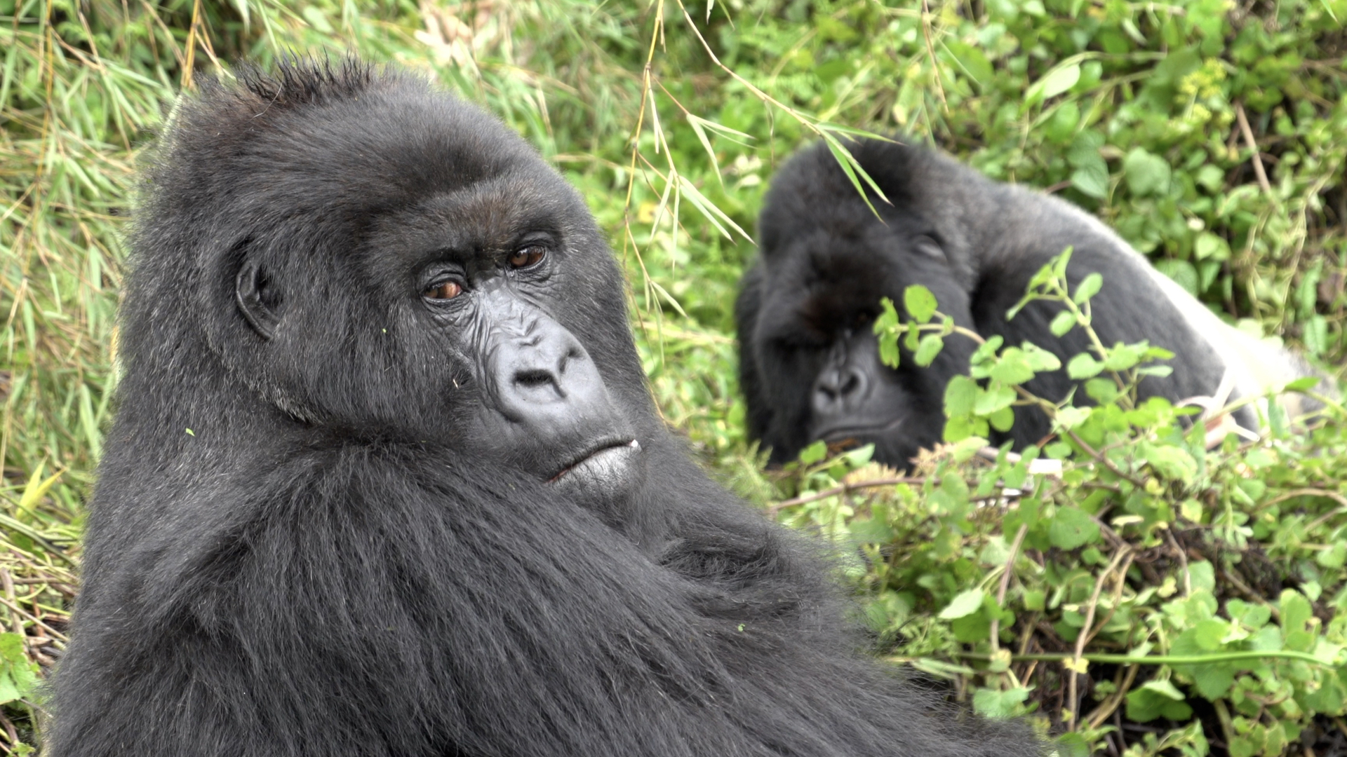 奥のシルバーバック(群れのリーダー)と手前のメス(No.1のメス)は長い間見つめ合っていました。